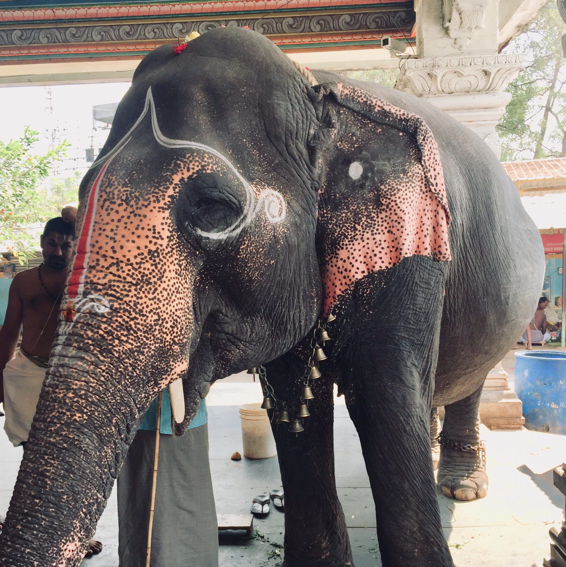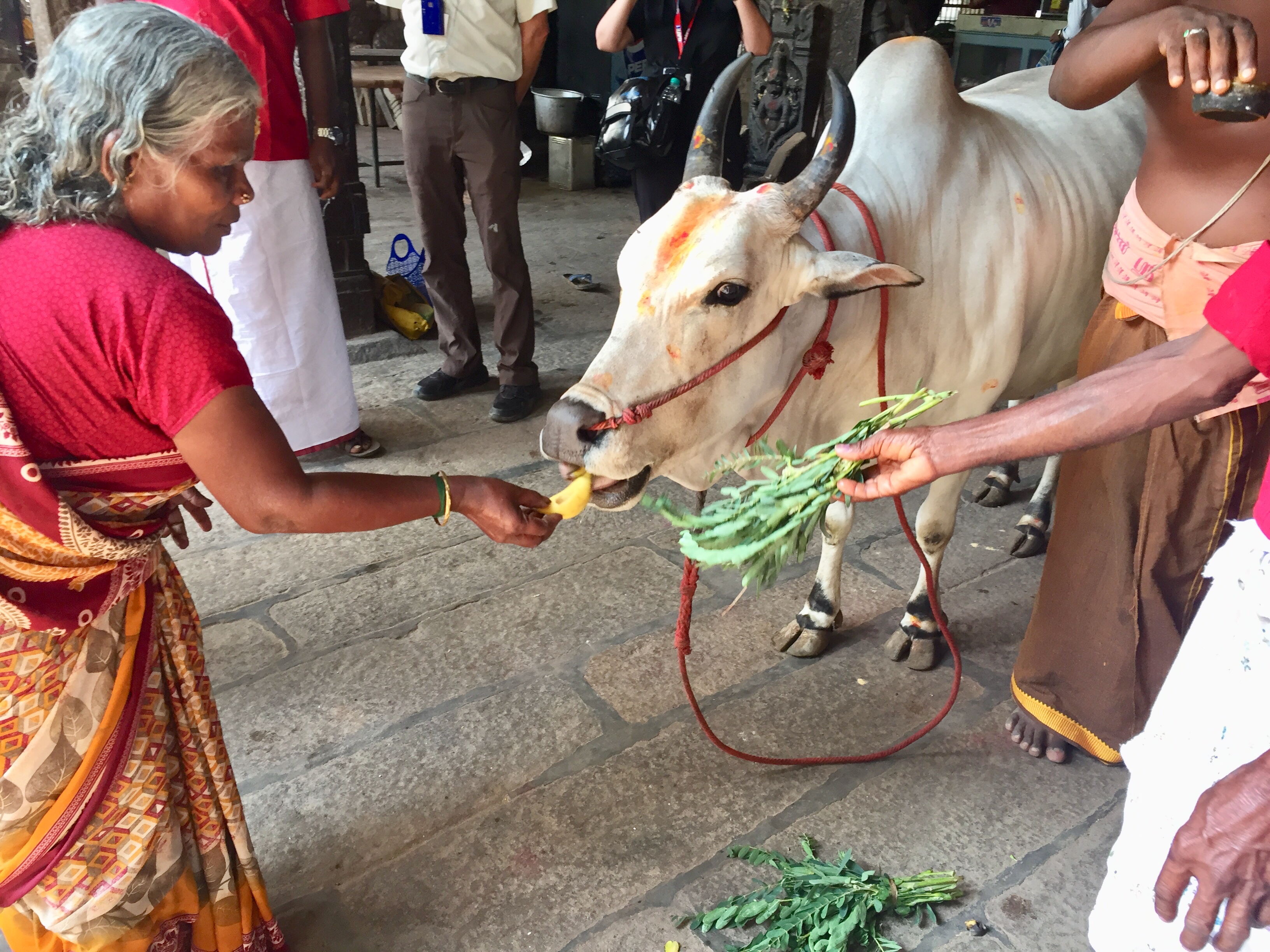 I’d been relatively at ease folding hands in Namaste greeting, accepting a red dot on my forehead, and eating with my hands, heavily spiced cuisine in the first few days of our South Indian tour. But a daylong tour of Thanjavur and nearby areas of south central Tamil Nadu clearly overloaded my cultural “comfort zone.” For those religious rituals that I observed then indeed proved shocking to my Western culture way of life. But to Hindu followers who we observed at our designated stops at Lord Brihadeeswarar Temple along the the Kaveri River, such seemingly odd behavior observed that day were considered perfectly normal expressions of Hindu spiritual beliefs. In fact, I found that many locals encouraged me to join in with their sacred rituals although I had little understanding about why I was actually doing them. I am curious then how you might react to such South Indian cultural practices as presented in the following photographs?