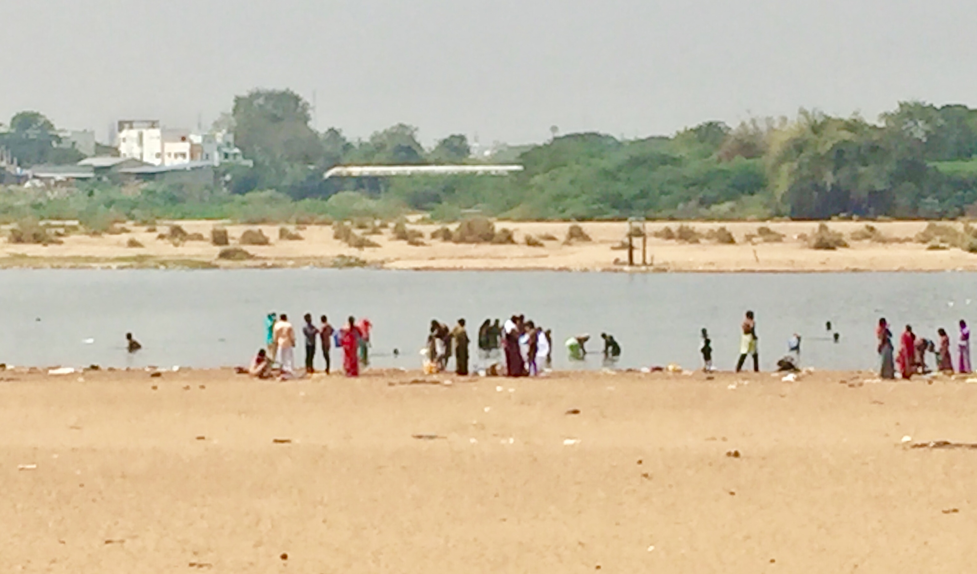 Picture an elderly man wading into the polluted river to scatter the cremated remains of a deceased family member as others enter the water nearby to swim, bathe, or wash clothes.