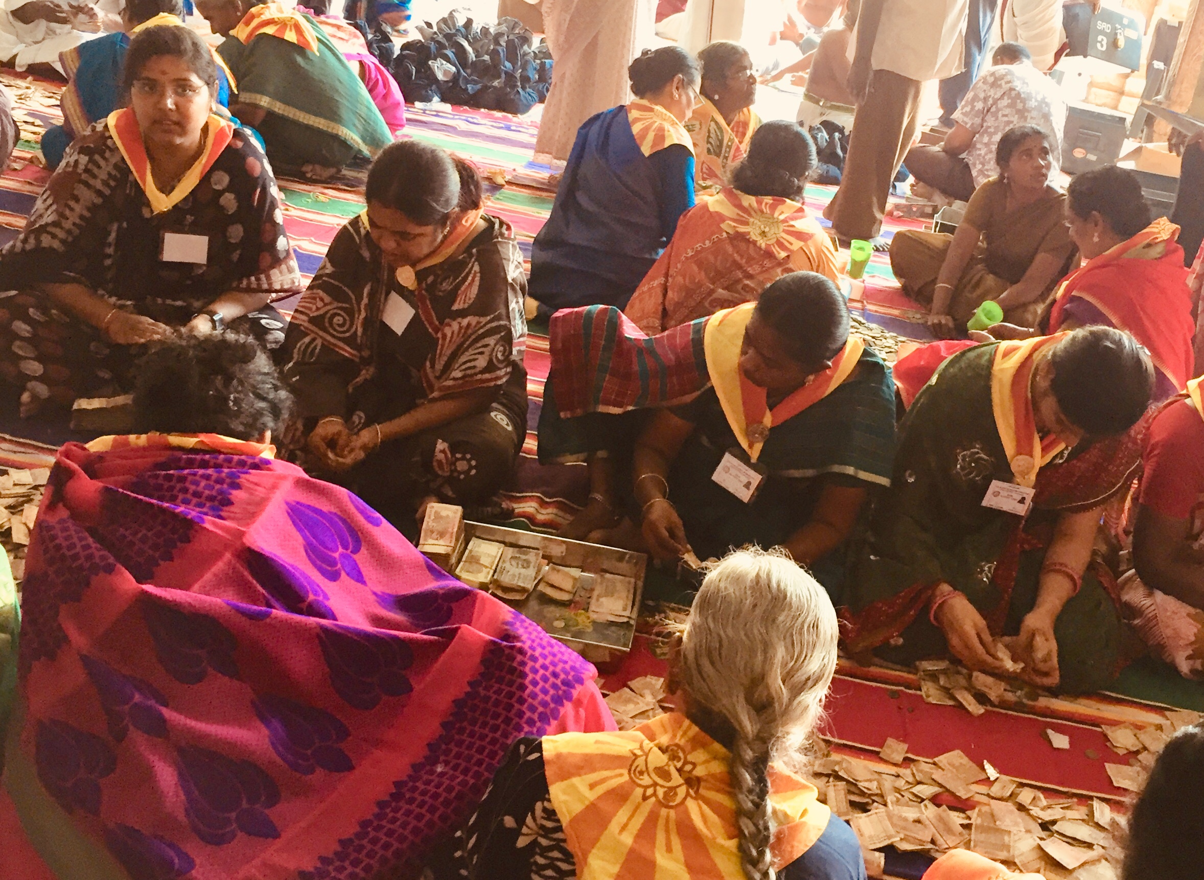 Notice how piles of Indian rupees are counted and shared for all in open gatherings on the floor of the temple.