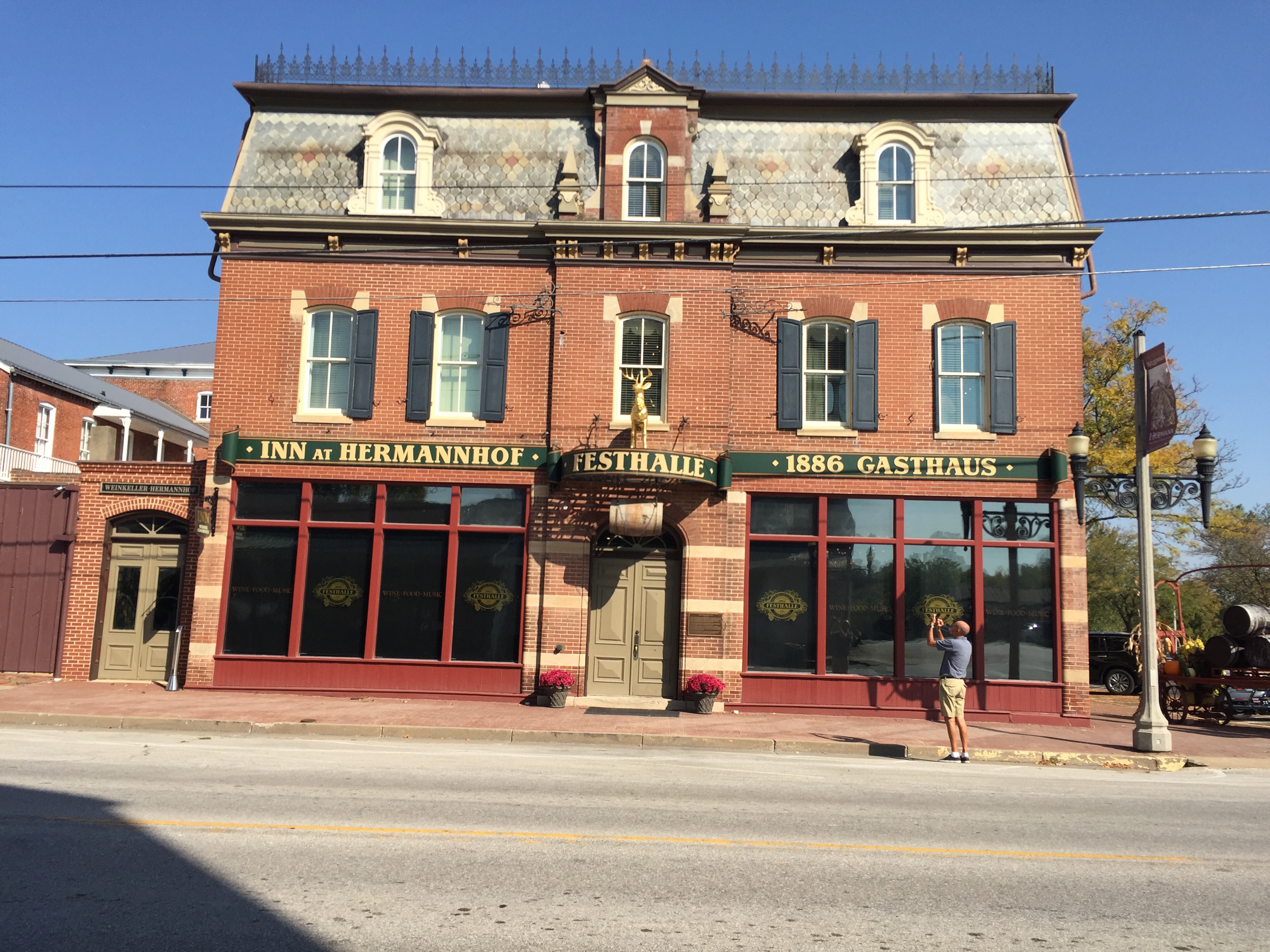 So during week two of our present adventure, we booked a two night stopover at the Vinchester Inn in the historic town of Hermann, Missouri. Known for it’s rich German heritage, our first impression of Hermann, founded by German immigrants in 1836 seemed to confirm the authentic atmosphere of “Little Germany” we so desired. For as we ambled from our hotel the next morning along Schiller Street toward the Missouri River, we gazed wondrously at such quaint brick structures as Chalet Luzern, Hermann House Gasthaus ,Weinkeller Hermannhof, and the Inn at Hermannhof along our way. Enjoying tasty brat and sausage cuisine at Hermann Wurst House afterward would suitably fill our desired German agenda as well. After lunch, our walking tour of Hermann’s Germanic influence would continue along the south bank of the Missouri river which served as a historic transportation hub for Hermann’s citizenry so successfully in the past. For German settlers once made Hermann one of the largest wine producing markets in the world during the steamboat/railroad era of the late 19th century.