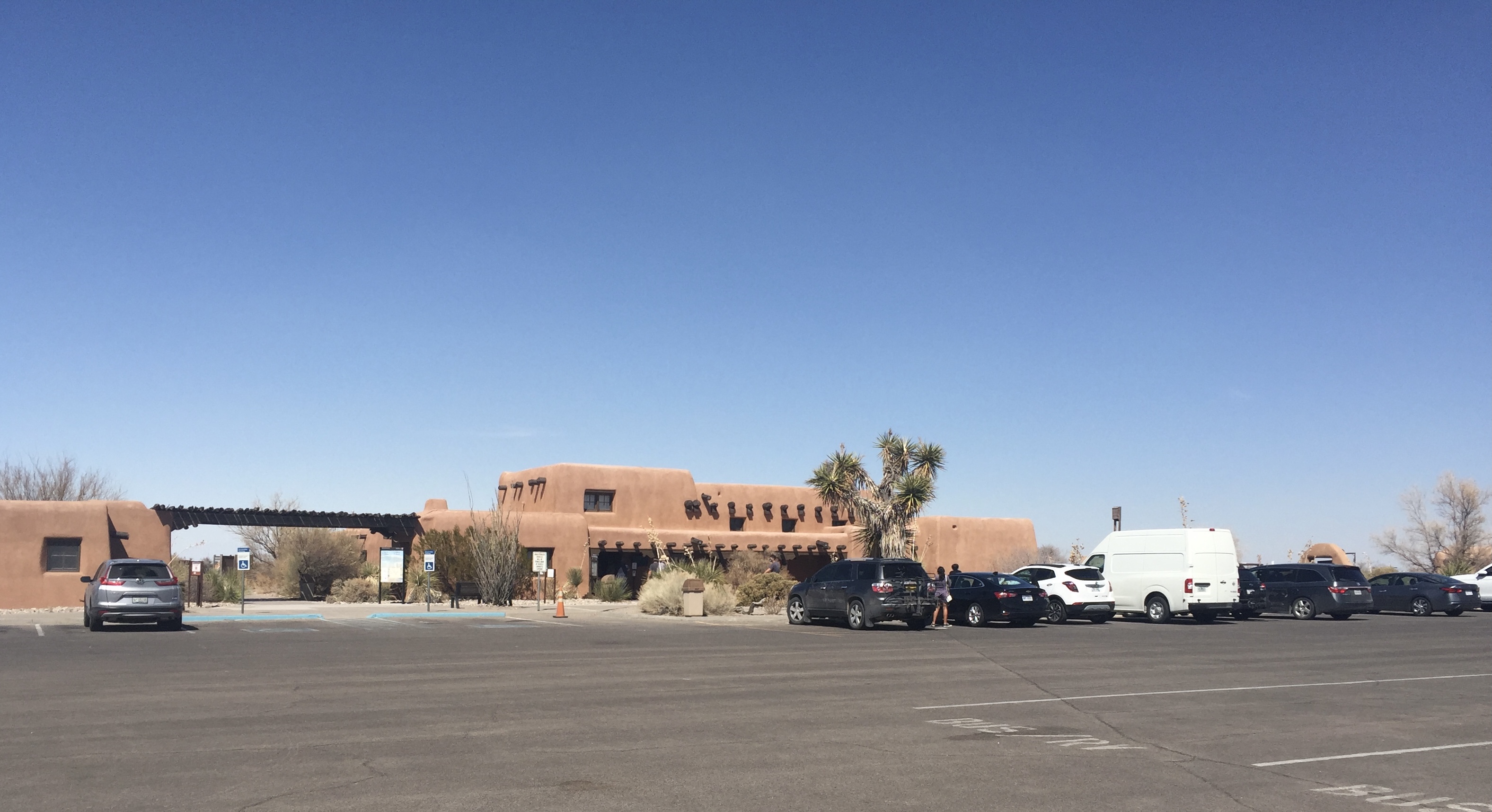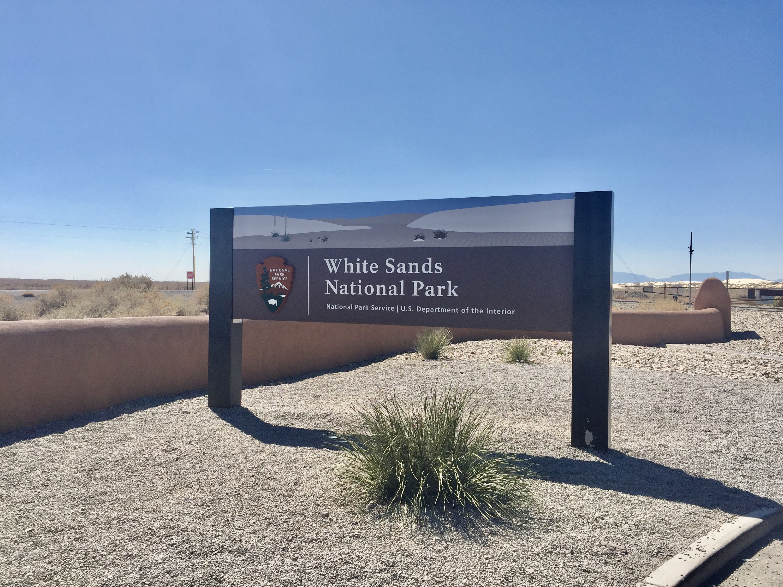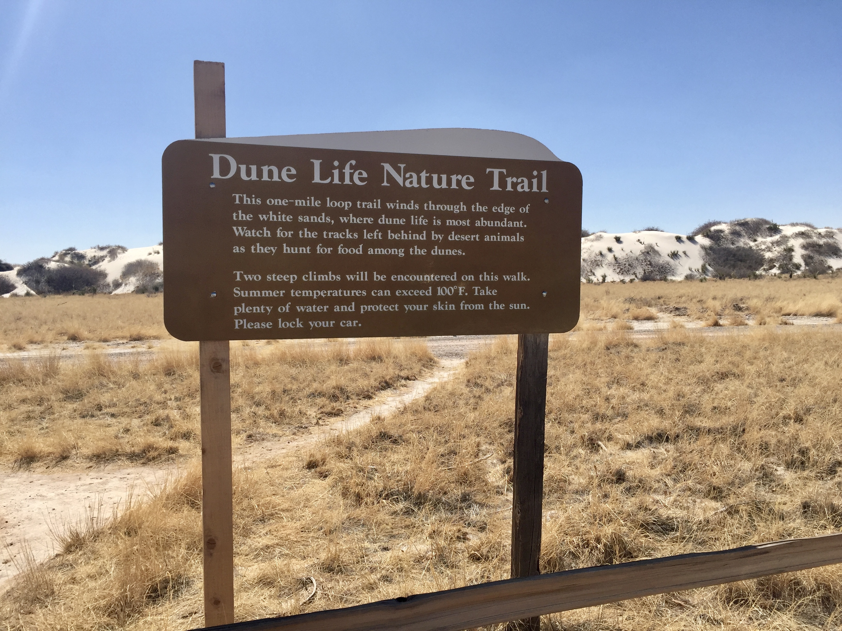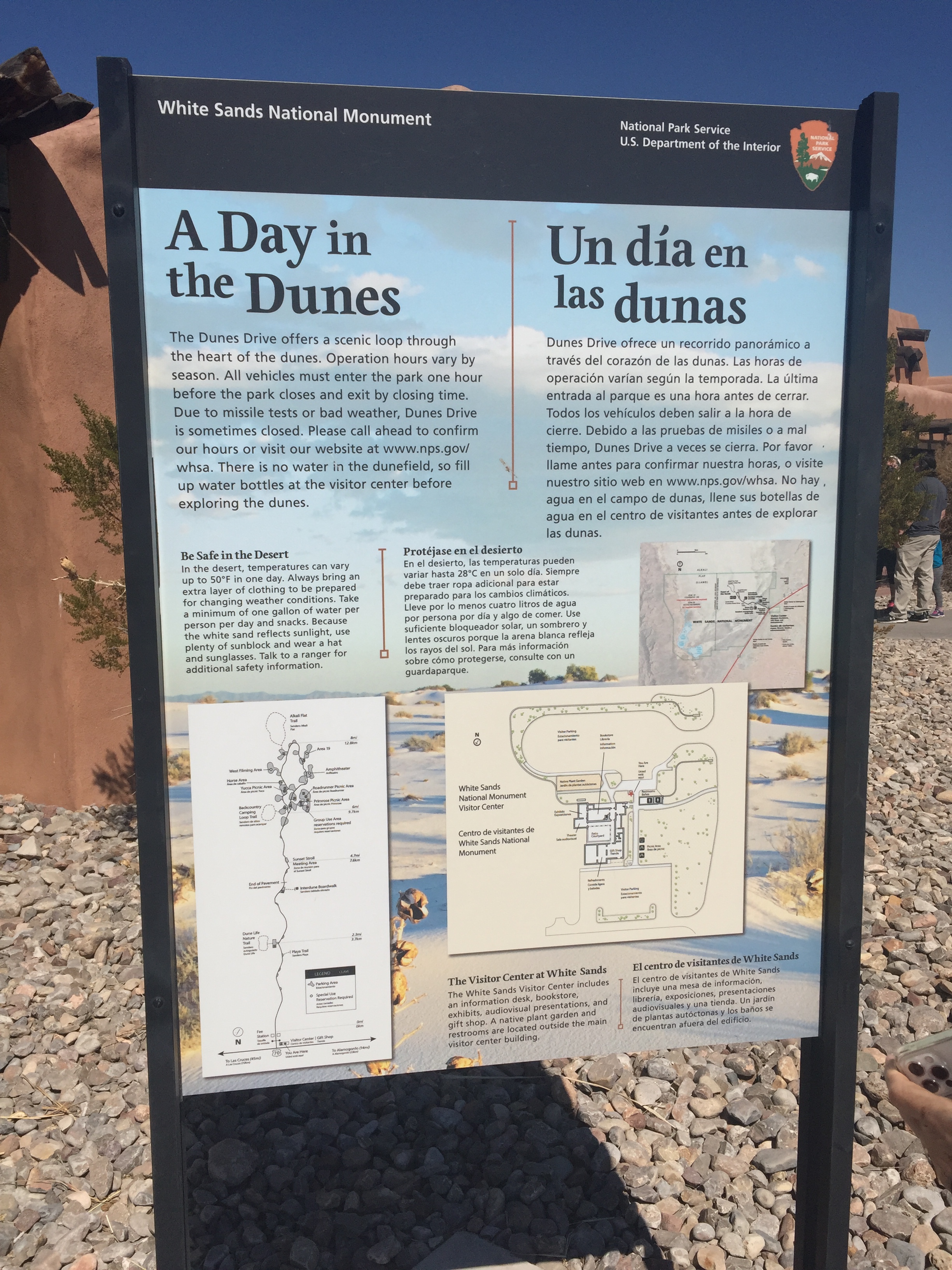 Driving south through the arid plateau region of New Mexico on unbusy Highway 54 and 70 to Las Cruces today on our road trip, our daily schedule allotted an hour or so in early afternoon to walk around White Sands National Park. My first impression of this vast sea of sand whiteness from afar convinced me that one wouldn’t want to lose their way around here. Upon learning that the White Sands Missile Range was situated very near to the park further confirmed such foreboding suspicions. For such safety reasons , I understand then why the federal government actually closes the park for public visits on days when missile testing takes place. It seemed shocking to me as well that that the U.S. chose to conduct atomic bomb testing during World War II in close proximity to this special place.