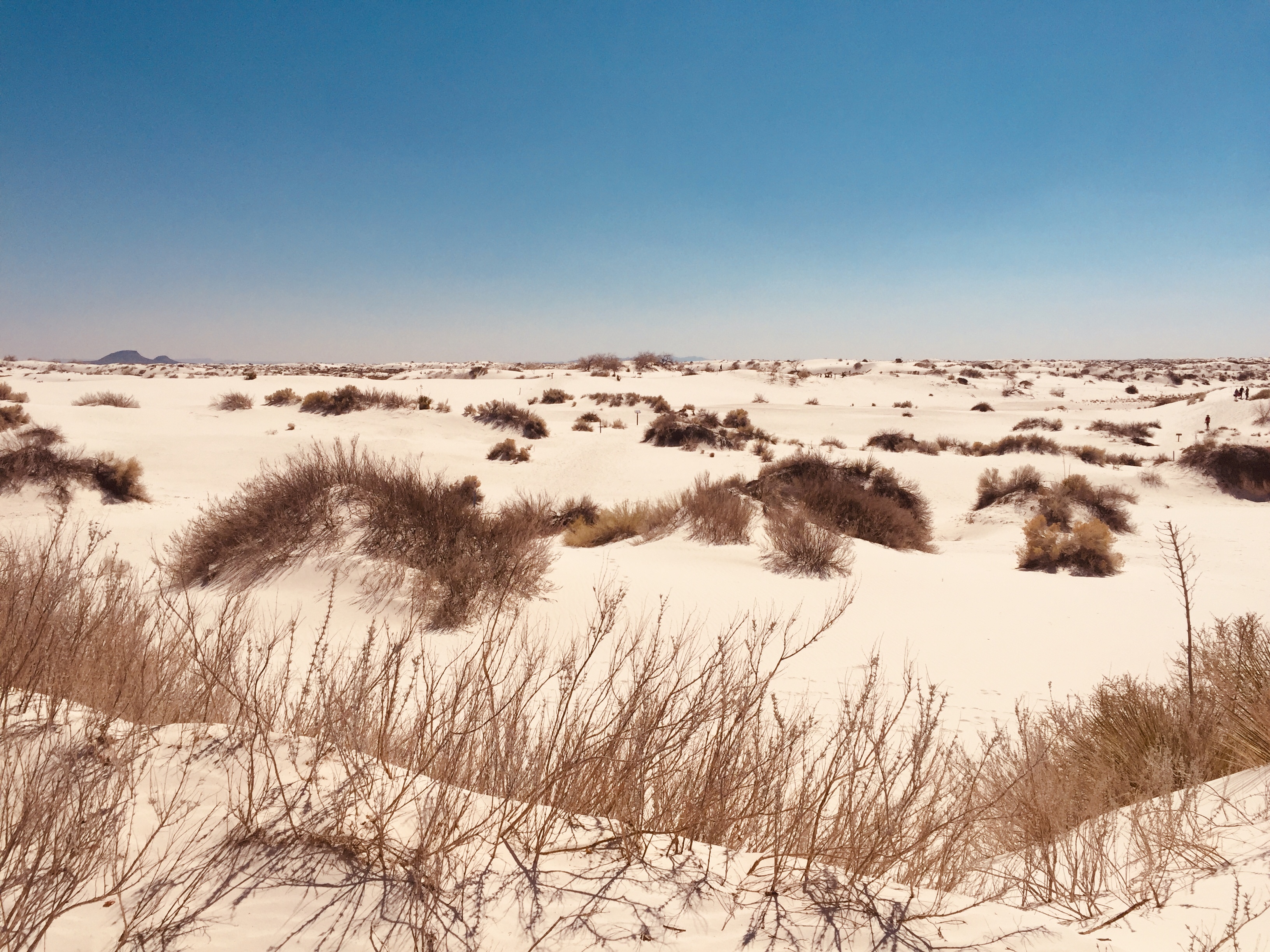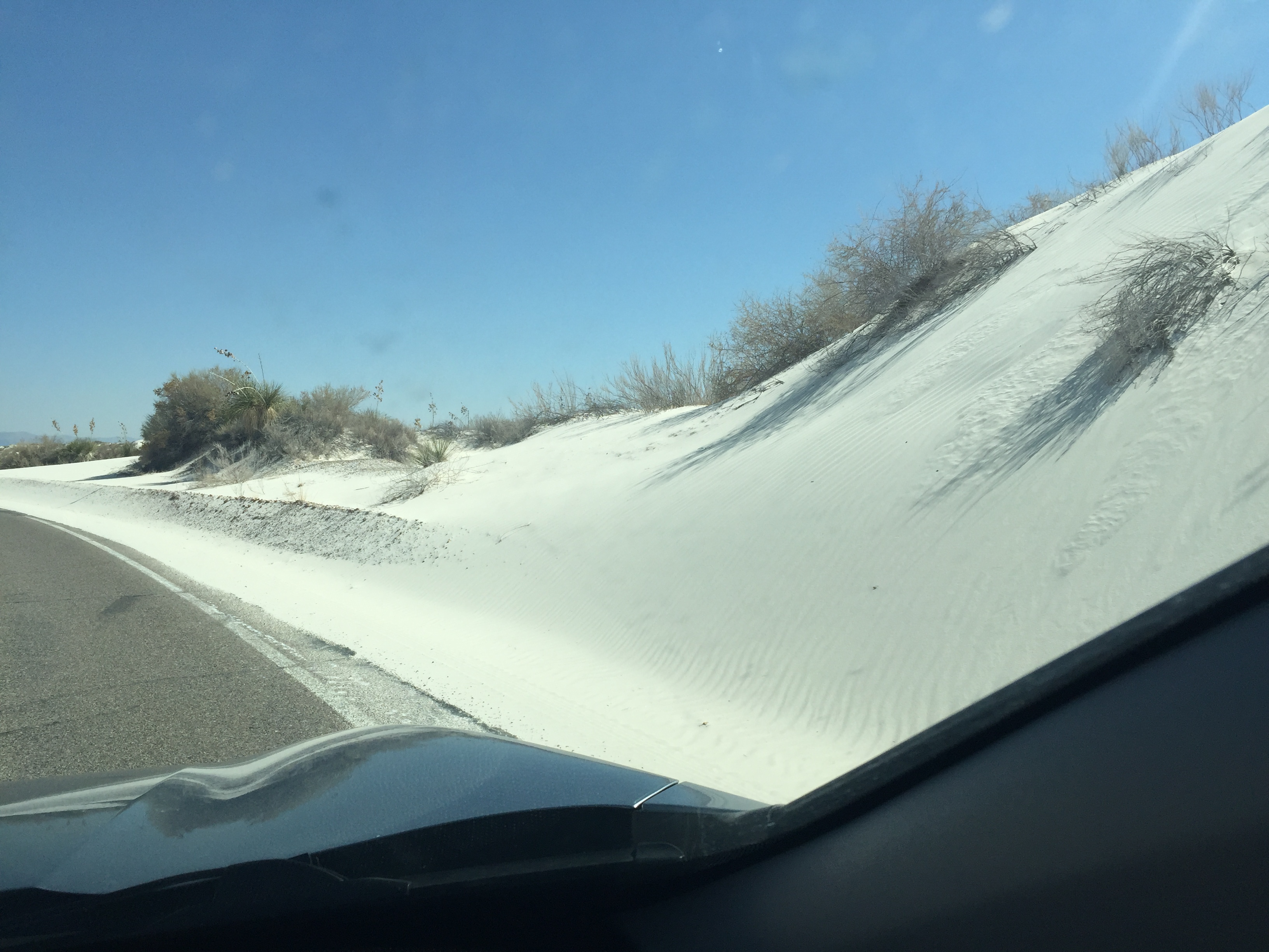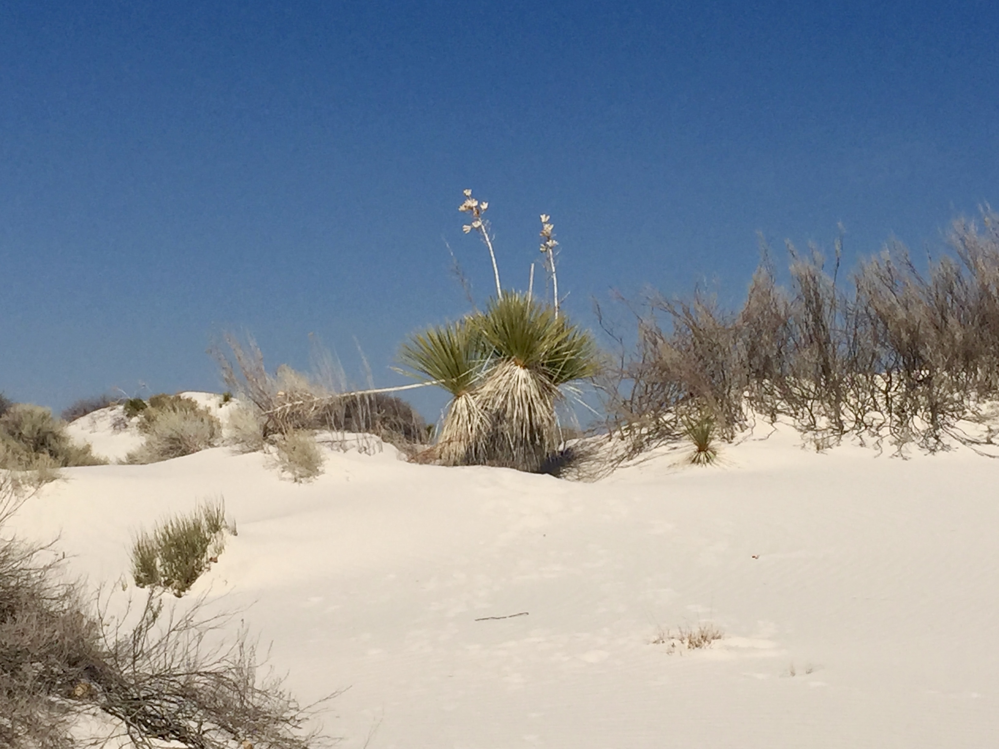 Driving south through the arid plateau region of New Mexico on unbusy Highway 54 and 70 to Las Cruces today on our road trip, our daily schedule allotted an hour or so in early afternoon to walk around White Sands National Park. My first impression of this vast sea of sand whiteness from afar convinced me that one wouldn’t want to lose their way around here. Upon learning that the White Sands Missile Range was situated very near to the park further confirmed such foreboding suspicions. For such safety reasons , I understand then why the federal government actually closes the park for public visits on days when missile testing takes place. It seemed shocking to me as well that that the U.S. chose to conduct atomic bomb testing during World War II in close proximity to this special place.