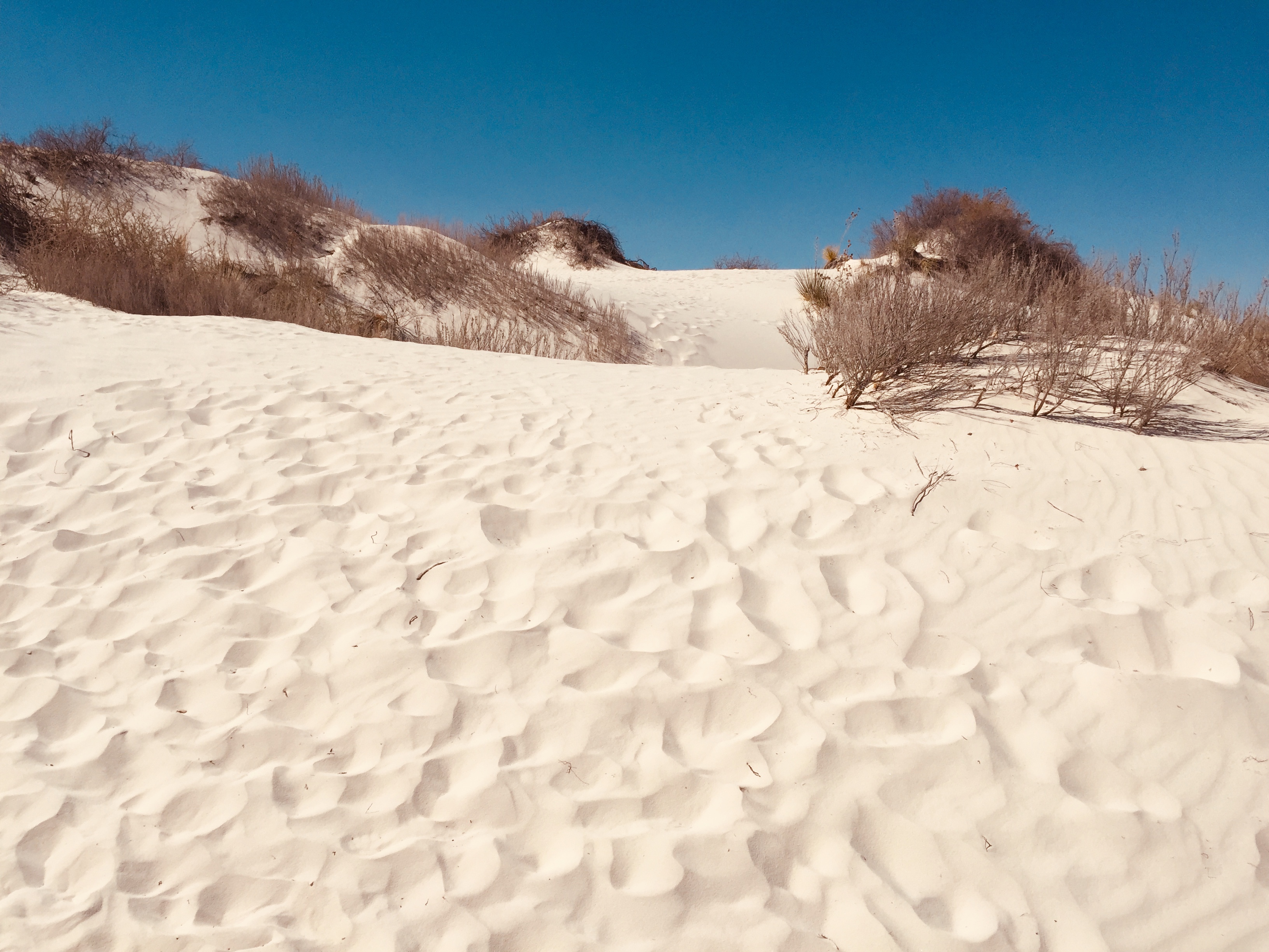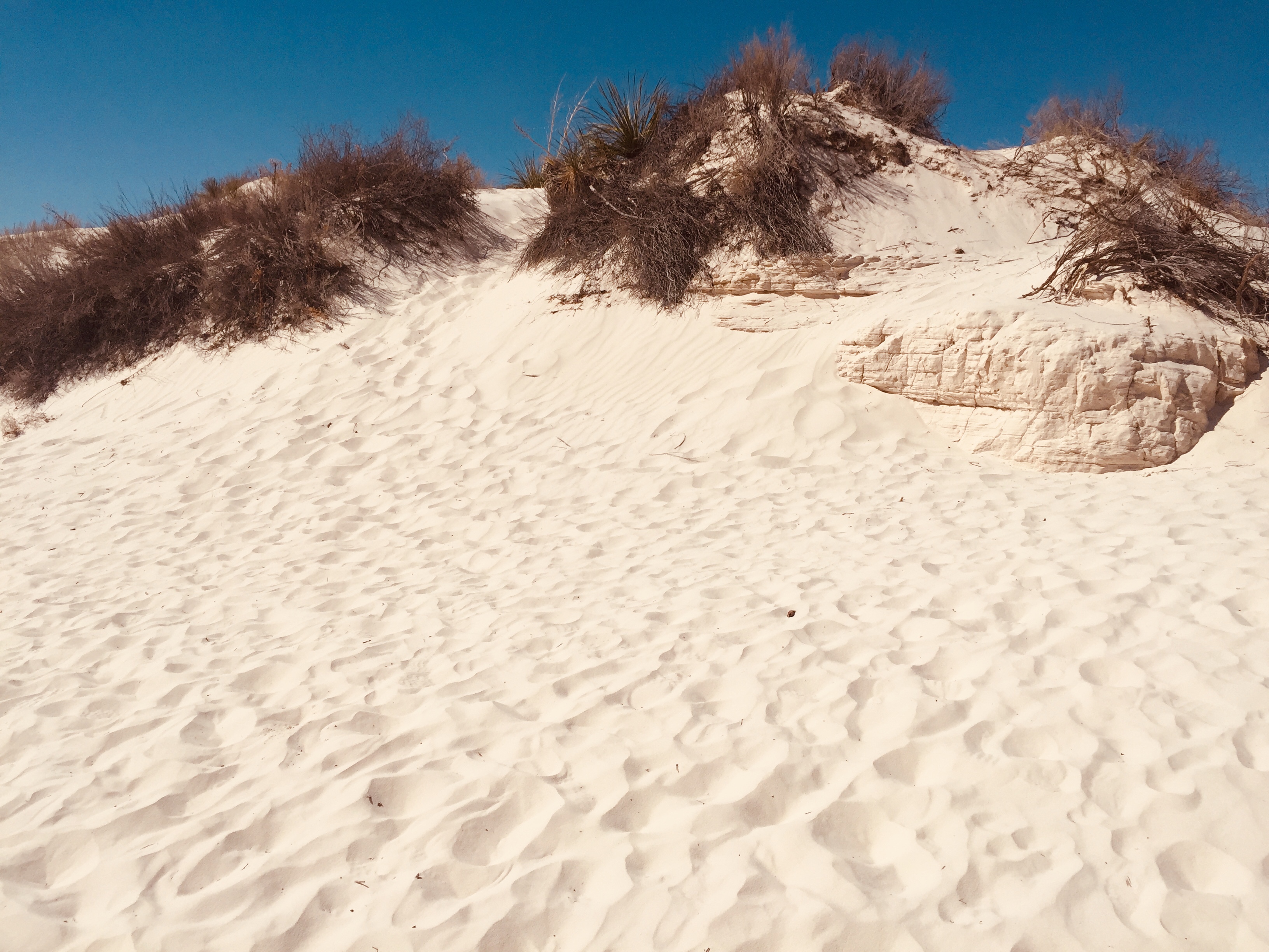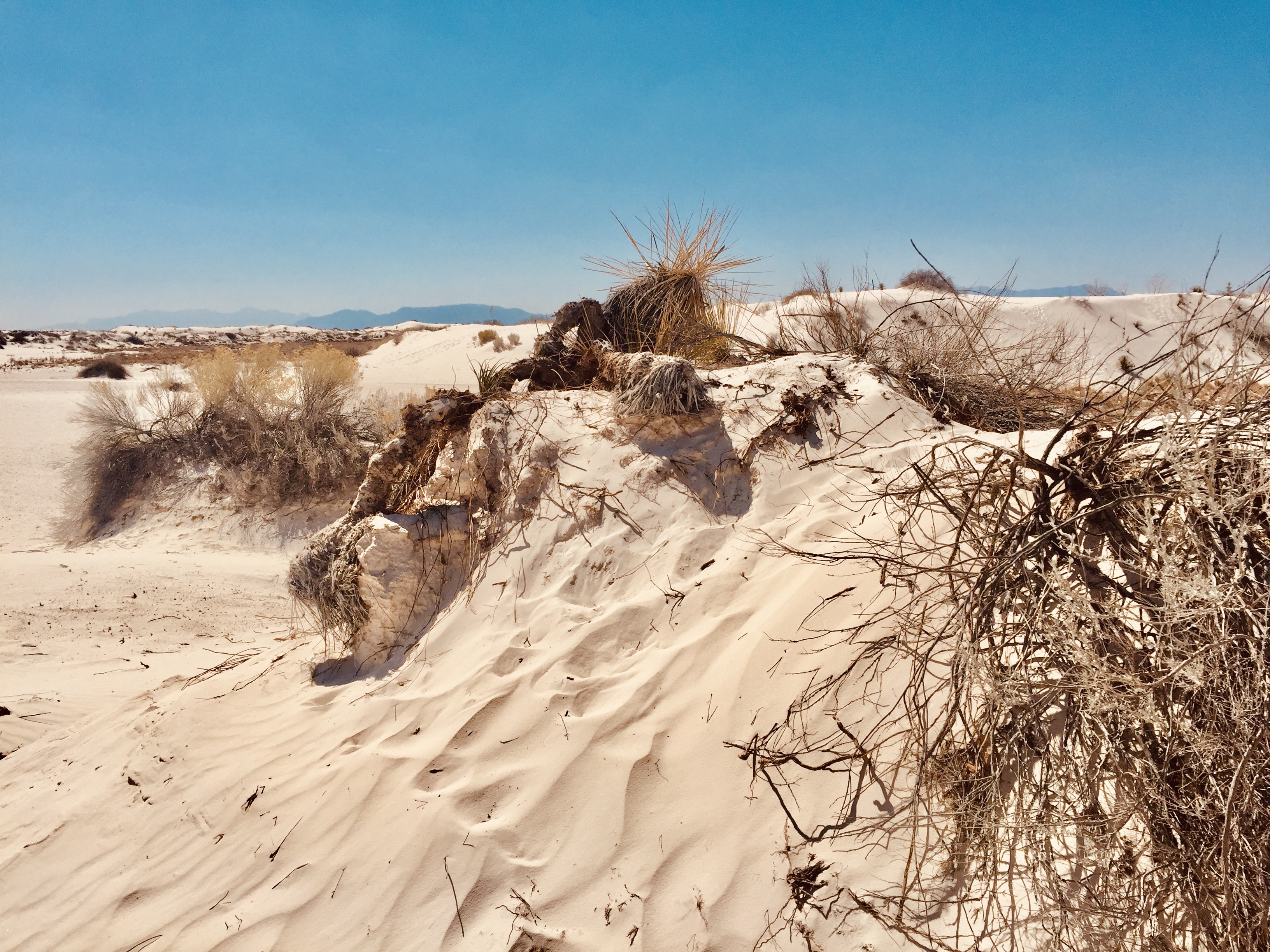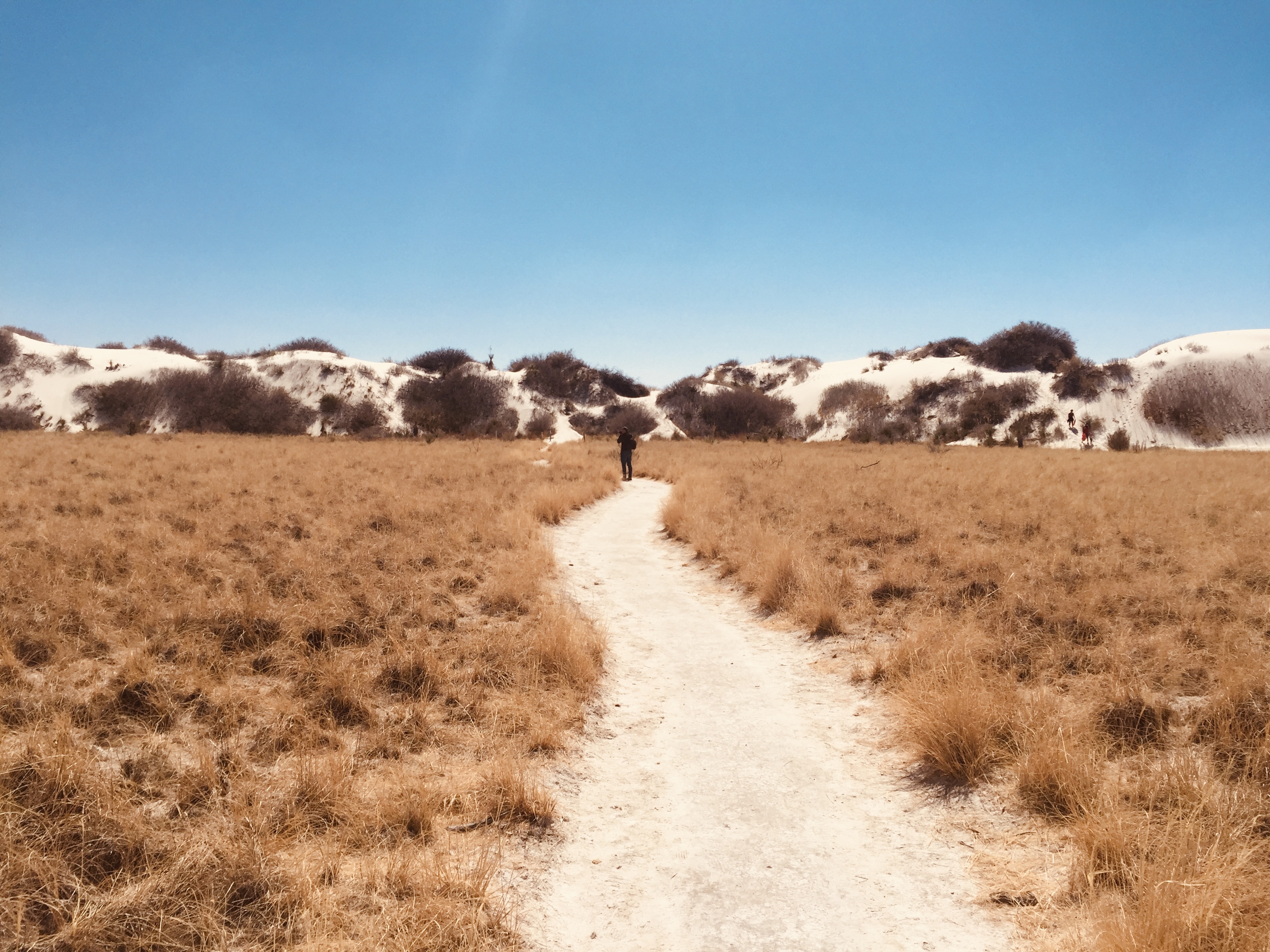 Driving south through the arid plateau region of New Mexico on unbusy Highway 54 and 70 to Las Cruces today on our road trip, our daily schedule allotted an hour or so in early afternoon to walk around White Sands National Park. My first impression of this vast sea of sand whiteness from afar convinced me that one wouldn’t want to lose their way around here. Upon learning that the White Sands Missile Range was situated very near to the park further confirmed such foreboding suspicions. For such safety reasons , I understand then why the federal government actually closes the park for public visits on days when missile testing takes place. It seemed shocking to me as well that that the U.S. chose to conduct atomic bomb testing during World War II in close proximity to this special place.