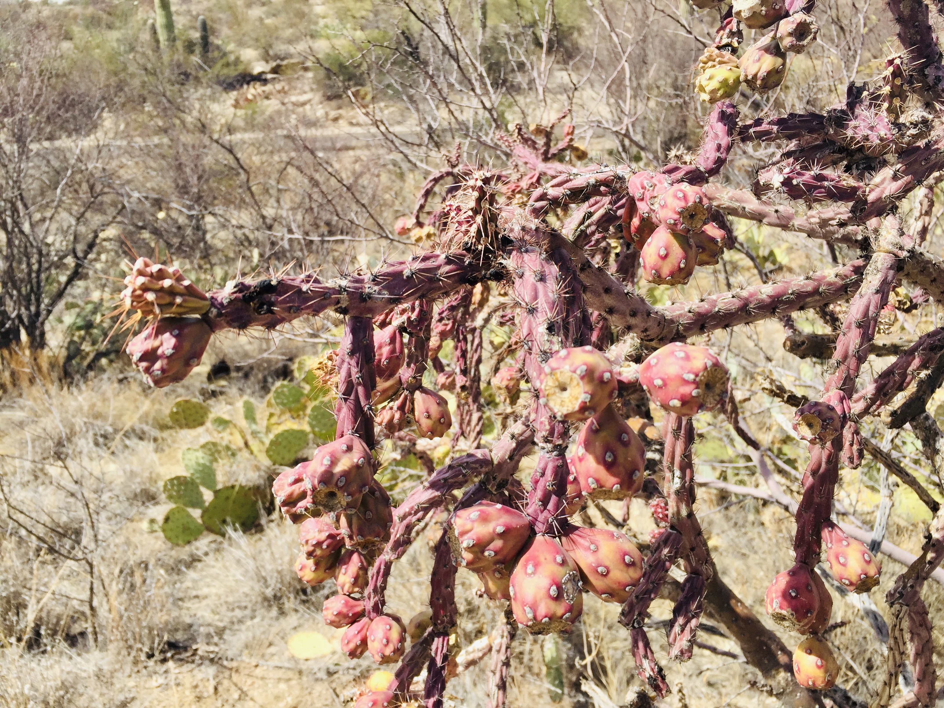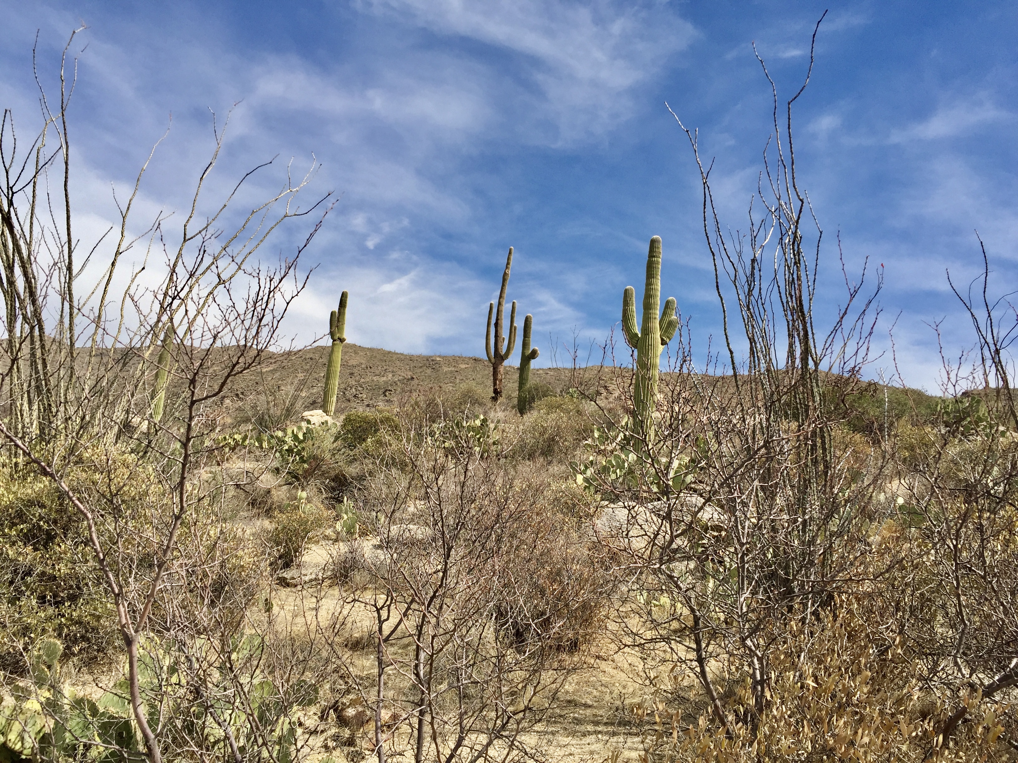 The next day, we drove west on I-10 nearby the U.S./Mexican border headed for our upcoming, two night stay in the Phoenix, Arizona region. On the way there, we elected to detour to through the eastern portion of Saguaro National Park in the Sonoran Desert near Tucson. After obtaining maps and walking advice at the visitor center in early afternoon, we then opted to hike for a short while along the Tanque Verde Ridge Trail, hoping to find heavy concentrations of Saguaro cactus plants in the distance to photograph. A distinct feeling of awe for these hardy specimens definitely set in for me then in realizing they can grow up to 70 feet high and survive in this harsh climate for up to one hundred years. Stopping along the trail periodically to take some close up “shots” of these desert environs, I observed the stunning beauty of other species of prickly cacti there. If you ever have more time than we did to visit Saguaro in the future, I recommend you drive the eight mile, Cactus Forest Loop Drive for a more thorough look at this magnificent desert ecology.