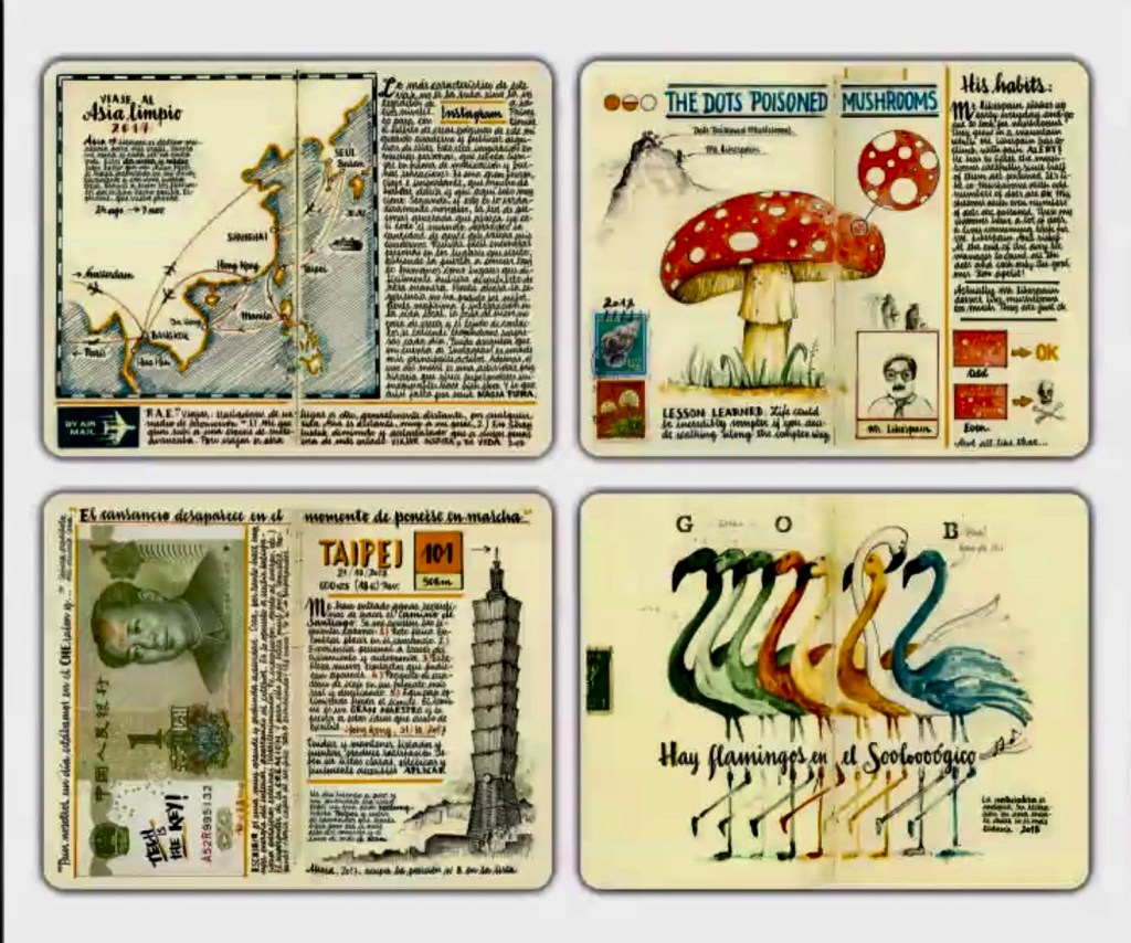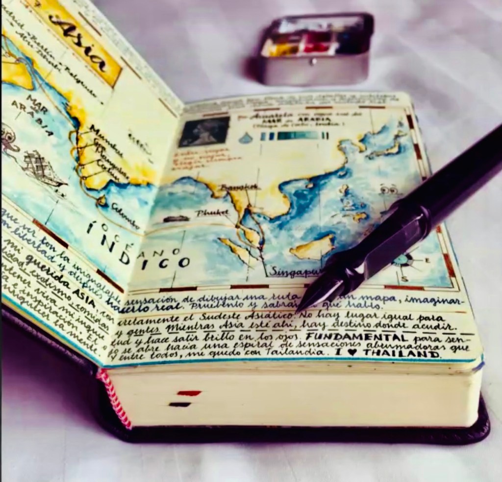 But there’s some good news to “calm the waters” of my current blog writing toil as a result of my participation in a “Zoom” Webinar recently watched on Atlas Obscura titled “The Secret Arts: Travel Journaling” For this two hour demonstration of several, beautifully designed travel journals by Spanish artist, Jose Naranja seemed to restore my interest in making my Word Press efforts more fun to create. How motivating it appeared to me then in knowing I could find total creative freedom by filling each page of a personal travel journal in a simple paper notebook with spontaneous expressions of words, images, and personal feelings during such present moments of travel. By recording such waves of thought in a variety of expressive ways for myself at the time of each visit, I also envisioned that my Word Press blogs would be accomplished with less memory loss and thus be energized with fresh newness about what I’d seen. My obsession to correct my mistakes in writing might also be avoided I thought as this free flow spirit of experimentation settled more into my mind.