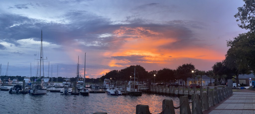 But then I happened to gain a fresh tourist perspective about the Beaufort experience from its celebrated home author of late, Pat Conroy. For I’d been inspired after reading some excerpts from his novel “The Water Is Wide” to take a more intimate look at this author’s time spent growing up and later experiencing literary success as a novelist in Beaufort. So my latest quest for Beaufort understanding began with an intimate look inside the Pat Conroy Literacy Center to begin our latest road trip this week. As I walked around the various halls showcasing authentic mementos from his Beaufort past, I discovered two places around the town that seemed of utmost importance to him while living there. So as Conroy once did, we first ventured to the southerly tip of Old Beaufort along Bay Street, to spend some quiet time under some massive oak trees and magnificent mansions lining the tranquil shores of the Beaufort River swamplands beyond. After dinner, we took an inviting walking tour of nearby Henry C. Chambers Waterfront Park overlooking a spectacular sunset which further enlightened us to the Conroy’s love of Beaufort as expressed through his novels. Enjoy the photos.