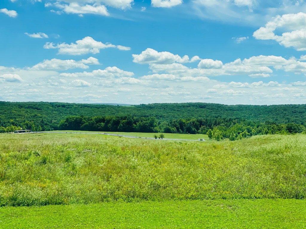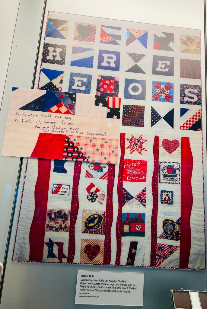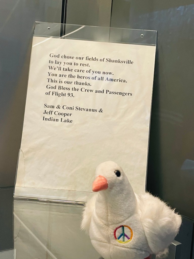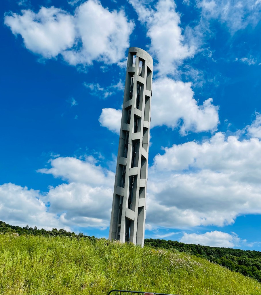 Two notable landmarks we visited then at this final resting place for those unselfish heroes who perished that day took place at the National Memorial Visitor and adjacent Memorial Plaza showcasing an extensive collection of family and friend remembrances and a detailed explanation of the tragic events that happened that day. We then drove a short distance to obtain a close look at the crash site now lined along it’s perimeter by a paved walkway leading to a poignant Wall Of Names. A final place of Flight 93 tribute took place a few miles back toward the main entrance at the Tower of Voices where wind chimes rang softly along this creative obelisk in musical remembrance to those victims that day.