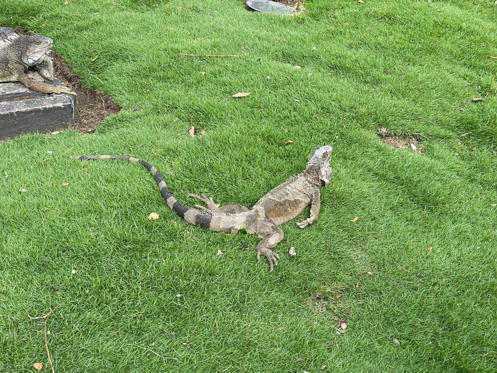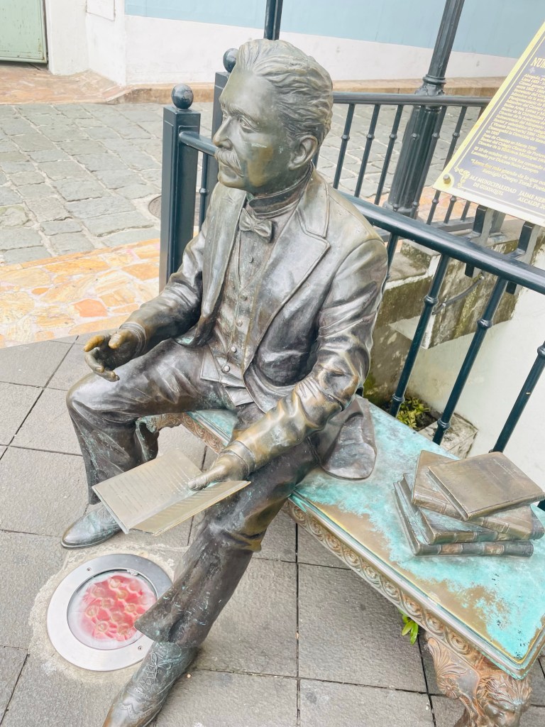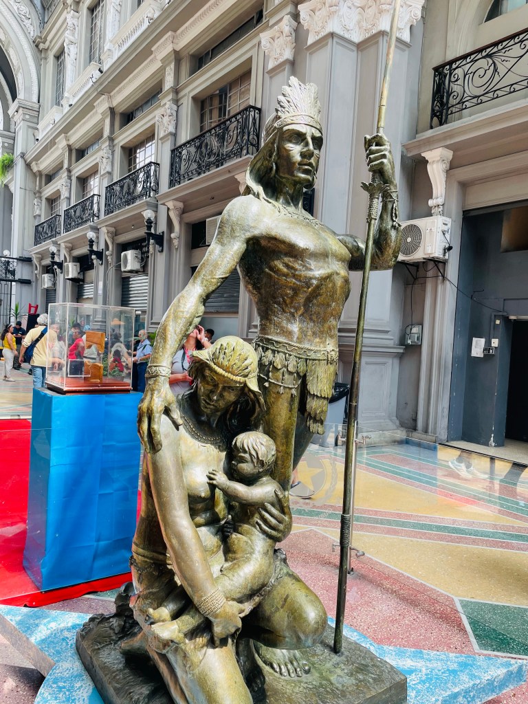 Strange tropical trees, colorfully exploding flowers and indigenous people statues seem to pop out of nowhere to break up the craziness of this traffic snarled city surrounding them. A large iguana stands its ground when I approach along a quiet pedestrian square. A statued man looking stately beyond from his inviting park bench seat reminds me to slow down and ponder this “tropical soup” more deeply.