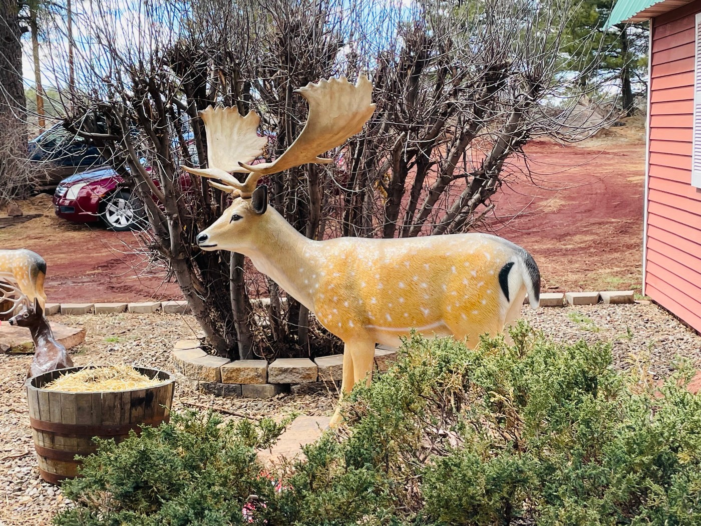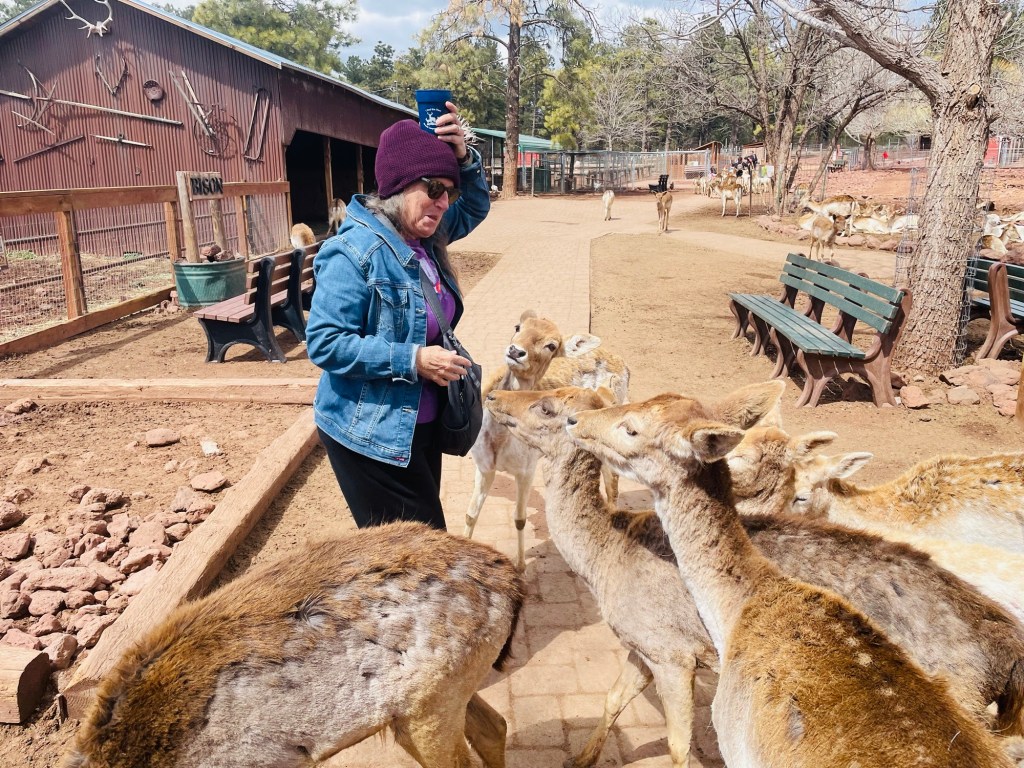 One of my more interesting hobbies during our westbound American road trips involves taking time to interact with wild animals in their natural habitats along side roads off the Interstate Highway. How fortunate for Ruth and me then that we took time yesterday to visit a rescue animal operation at the Grand Canyon Deer Farm along historic Route 66 nearest our next stopover in Williams, Arizona.