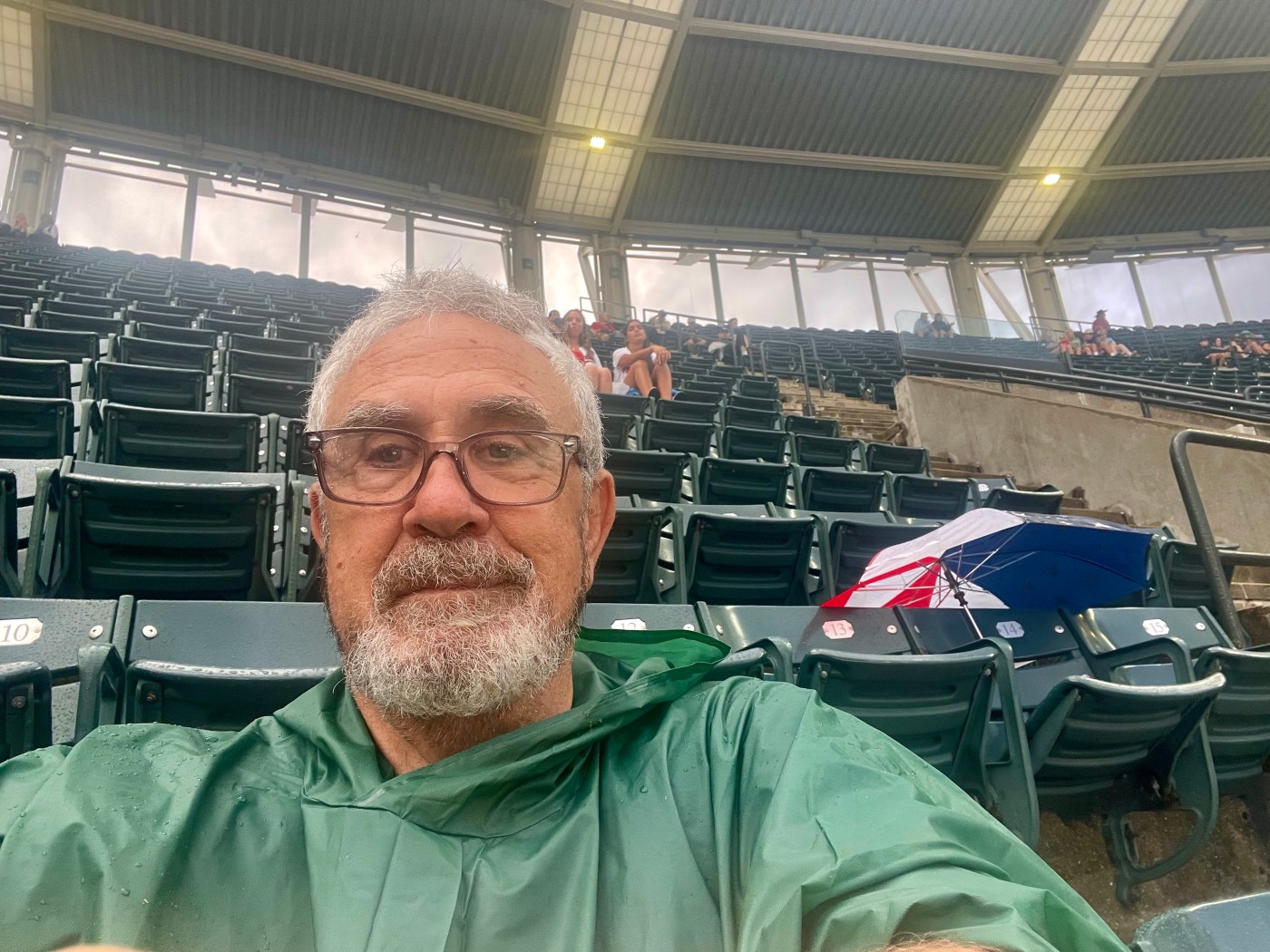 Finding some relief from this weather predicament, I notice hordes of baseball fans like me have also chosen to be here tonight not knowing how long the rain delay will last or even whether the game will be played. So I’m resigned to just wait at my upper deck seat mummified in my poncho, watching one squall after another pass through the area. Finally, around two hours later the game is called.