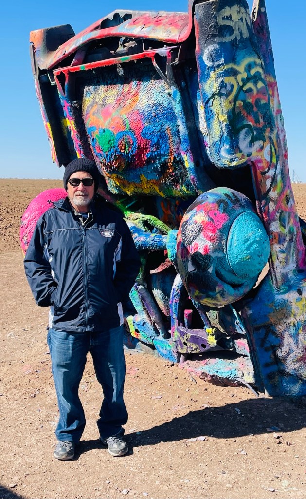 A “hunk of car junk” on the prairie  made a nice place to savor artistic beauty. (Amarillo, Texas)