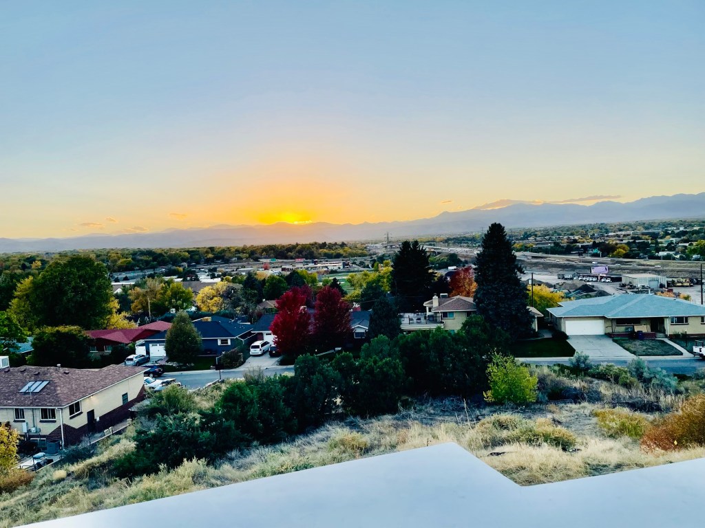 An unobstructed viewpoint of a westward sunset provided current traffic information to and from the Rocky Mountains. (Denver, Colorado)