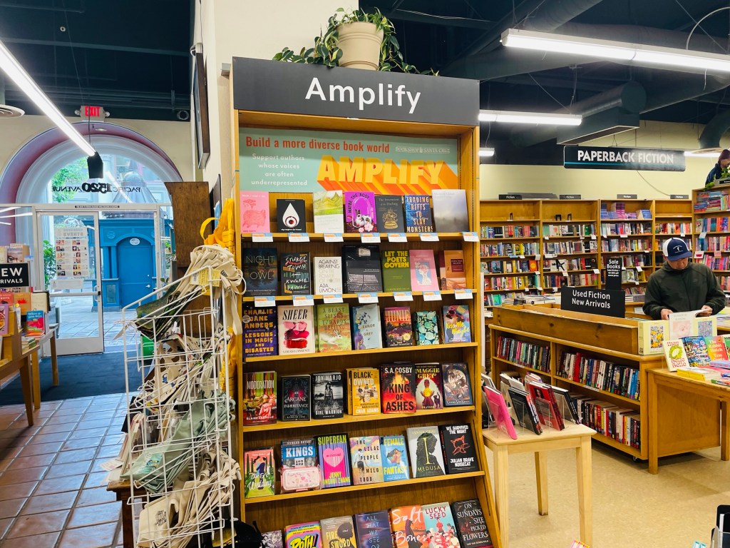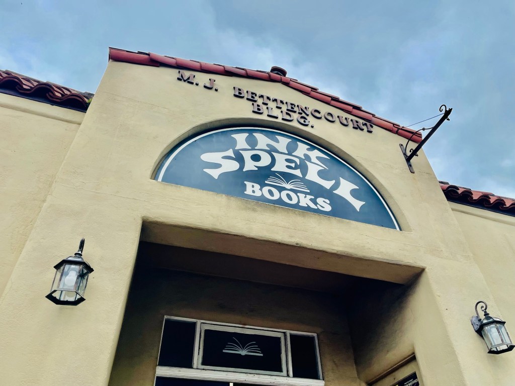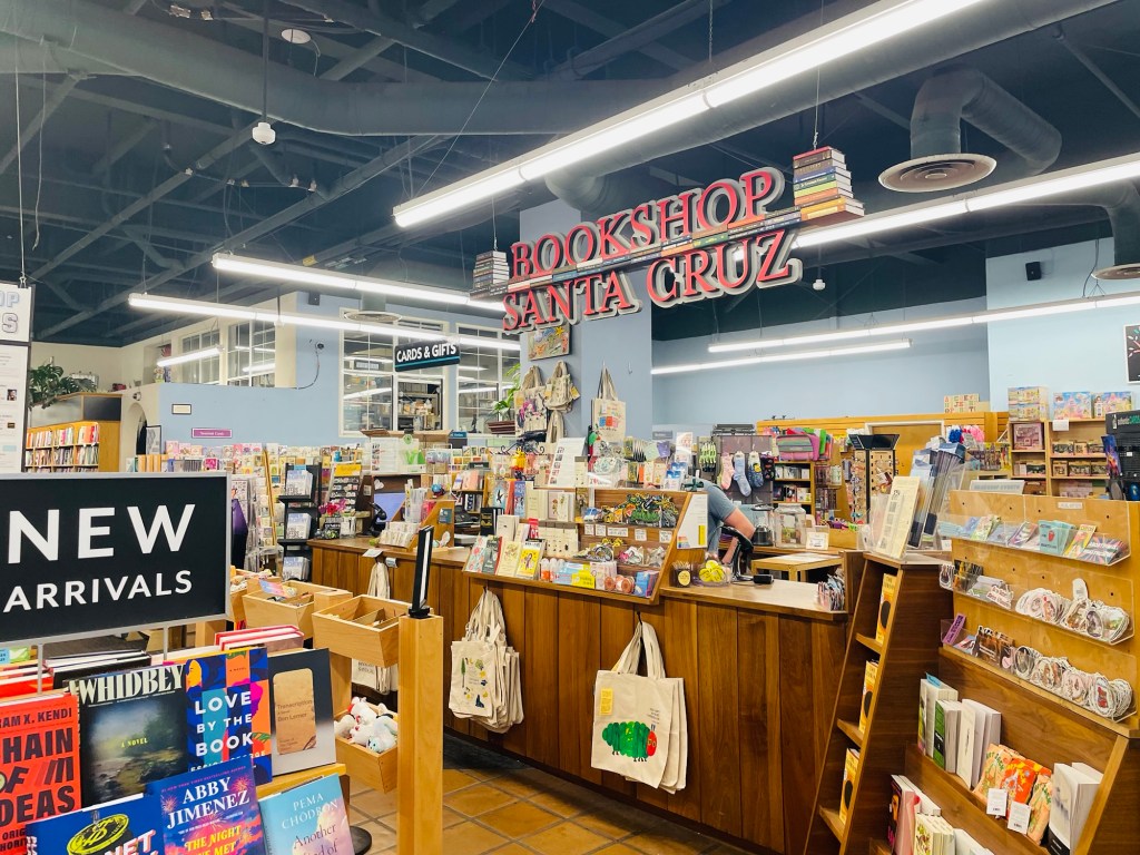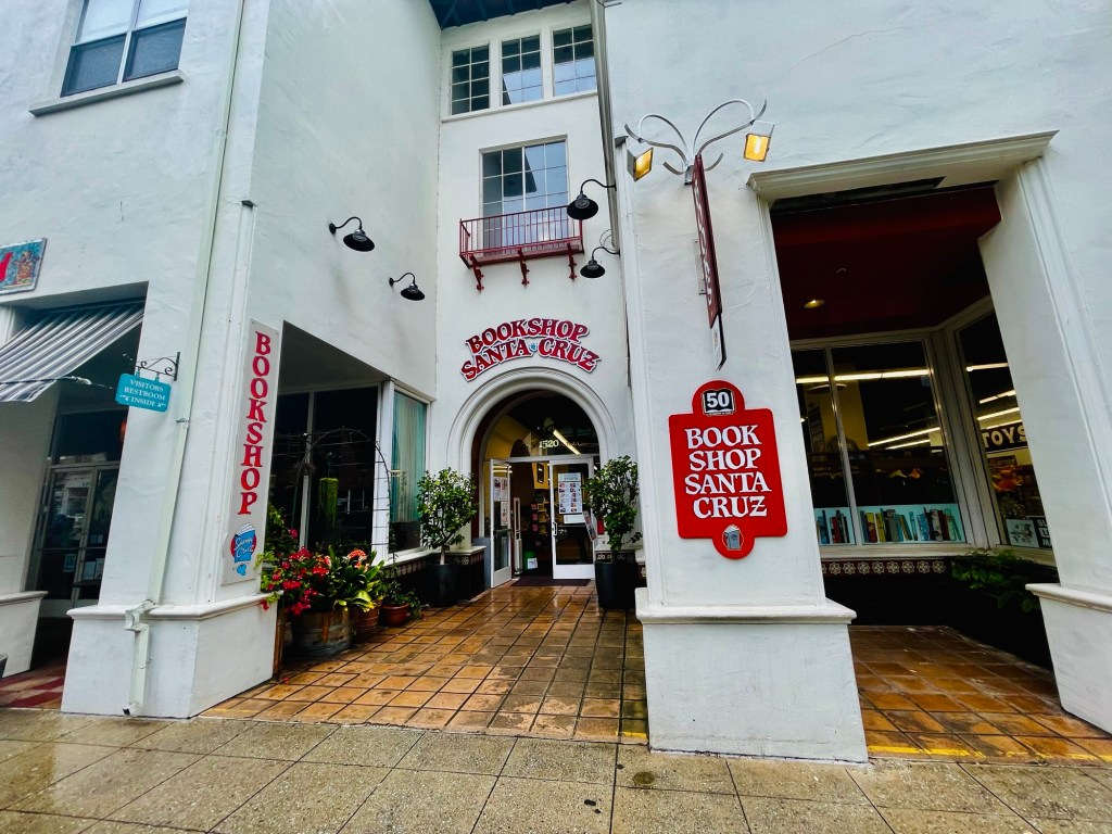 It looked like a stormy weather weekend in Santa Cruz, California. So I thought where would be a logical place for me to head when the skies turn gray? Thus awakening to the rain pelting down steadily beyond the bedroom window of our bungalow, making alternative plans for daily activities thus weighed heavily on my mind this Saturday morning. With good timing, I’d then recalled the enjoyment I felt from the creatively customized management of two independent bookstores we’d previously experienced in California on this road trip; “Vromans” in Pasadena, and “Ink Spell ” in Half Moon Bay. Consider for instance that “Ink Spell” during our visit offered a $2.00 per book promotion called “Grab Bag” involving prewrapped novel purchase options labeled only with their respective genre. I’d thus randomly took a surprise chance at historic fiction, biography, and sports, and “hit the jackpot” with three interesting novels.