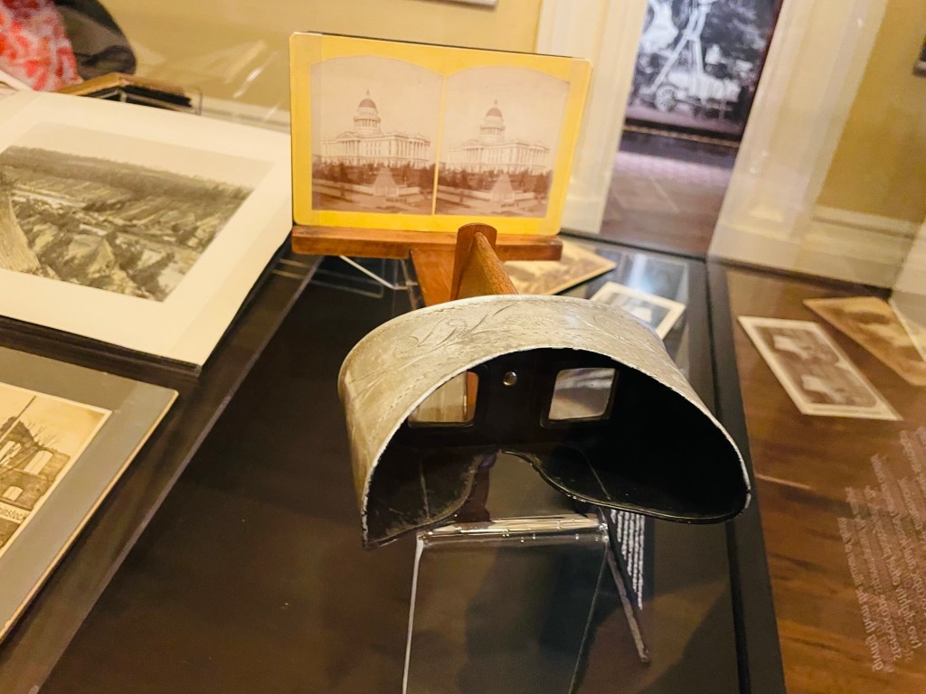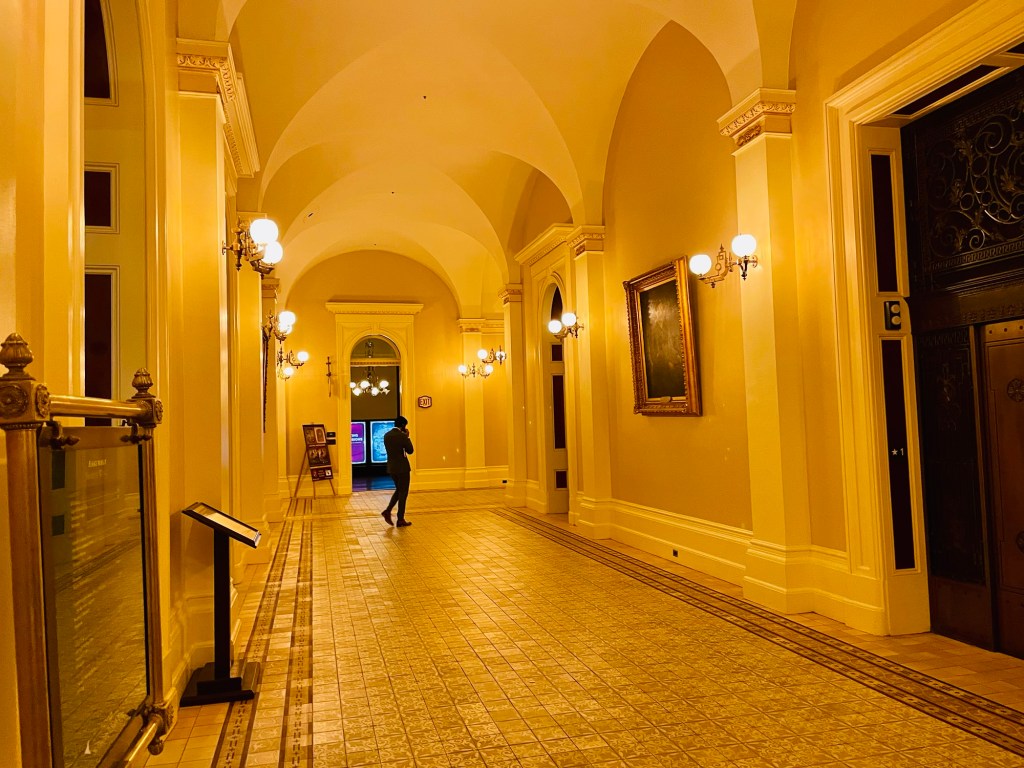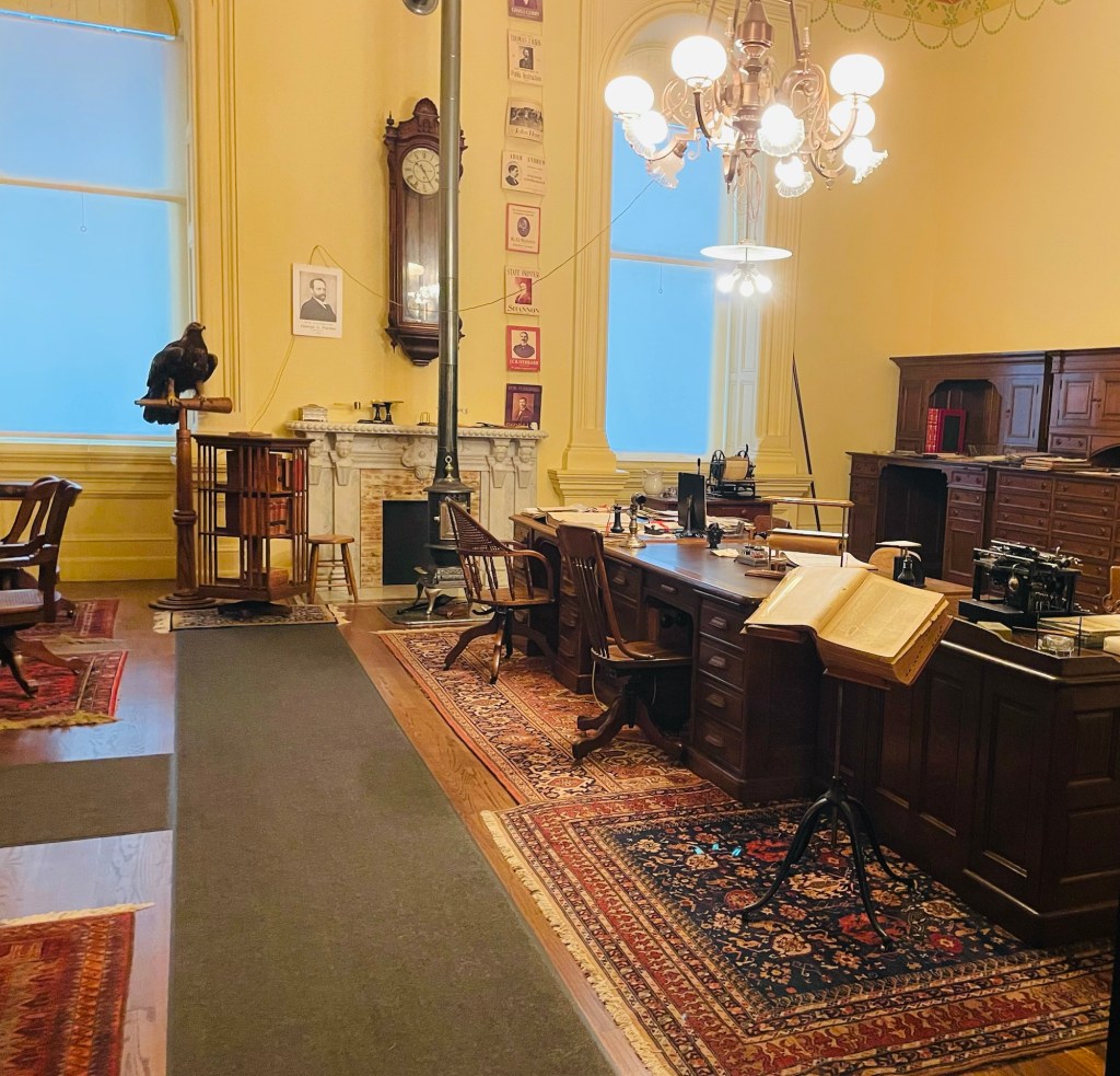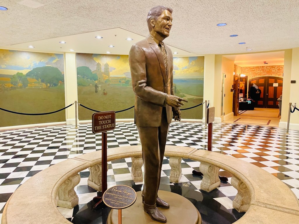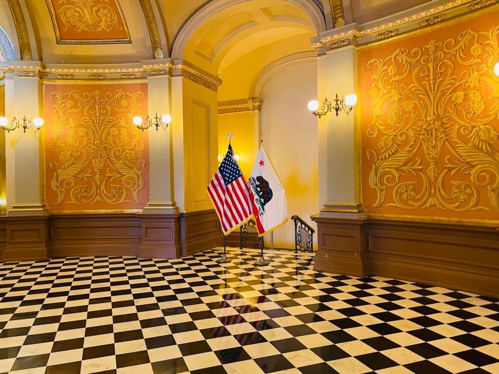 The next day, our Sacramento tour continued with a visit to the California State Capitol  Museum. Our self guided tour of the interior took up most of the morning  as we visited historic rooms of state government use dating back from the late 19th century as well as those prominent gathering areas presently used  today.  ln those moments, each setting felt orderly arranged yet more quietly experienced than expected. Then exiting to the expansive capitol lawn noticing minimal city noise nearby,  I found good reason instead to serenely concentrate on  tree landscape and sculptured memorials well placed within the park.