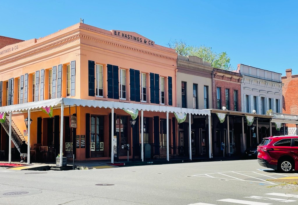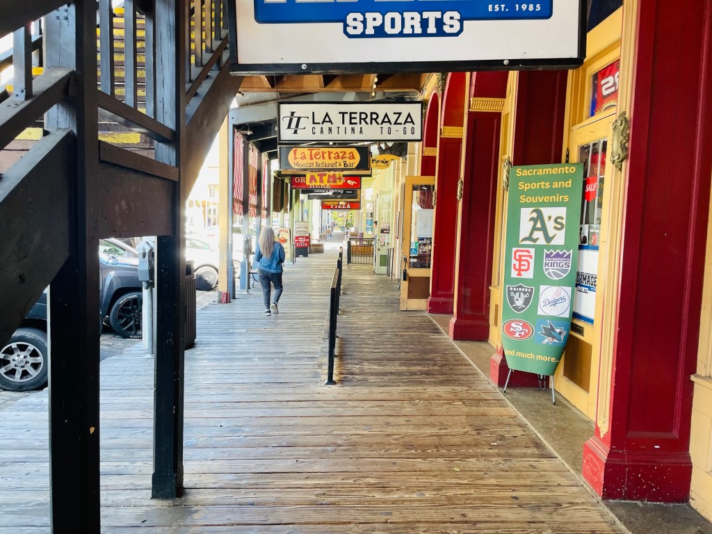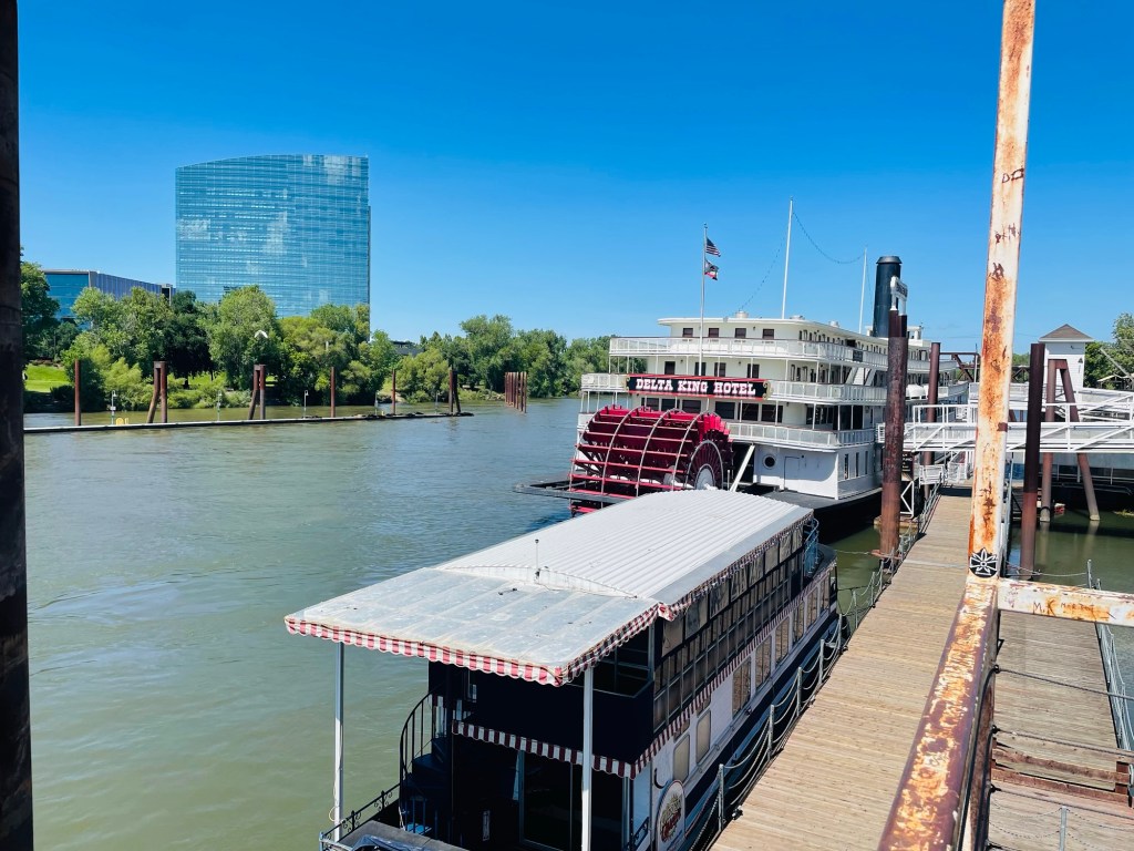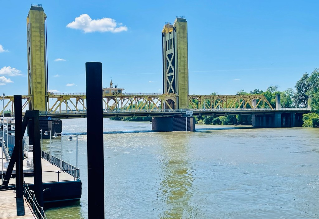 We then continued moving at our own slow pace to  the “Old Sacramento” waterfront area. After finding surprising ease of parking space close by, around lunchtime we sauntered along old wooden walkways to satisfy our curiosities of historic buildings dating from the 19th century “gold rush” era of California’s discovery times. Deciding what to do then really didn’t really matter as we renewed our energy with the cool breeze coming off the river to  invigorate us at that time. Afterward we closed this relaxing day trip with an unrushed  riverside stroll which provided us picturesque viewing spots of the famed Tower Bridge boldly painted all gold and the reconstructed Delta King riverboat as well.